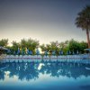 Piscina scoperta circondata da lettini e palme al tramonto.