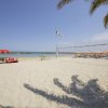 Spiaggia con rete da pallavolo, ombrelloni arancioni e bandiere, vicino al mare.